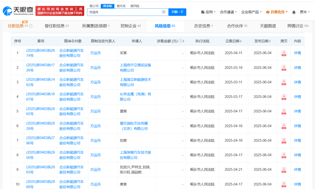 天眼风险信息显示,方运舟现存多条限制消费令信息,限消令对象包括合众新能源汽车股份有限公司、北京哲合新能源科技有限公司、北京众联天下汽车销售服务有限公司等。此外,其名下还存在多条股权冻结信息,其中,今年5月,方运舟所持哪吒汽车关联企业合众新能源汽车股份有限公司股权被全部冻结,冻结股权数额2000万人民币,冻结期限自2025年5月13日至2028年5月12日。