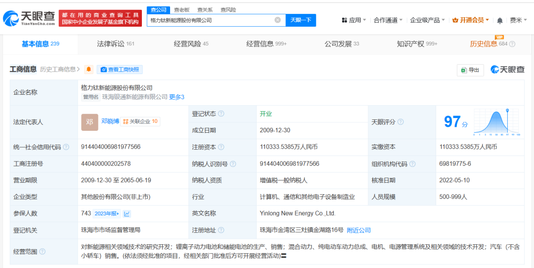 格力钛新能源股份有限公司成立于2009年12月,法定代表人为邓晓博,注册资本约11.03亿人民币,经营范围包括对新能源相关领域技术的研究开发,锂离子动力电池和储能电池的生产、销售等,由格力电器(000651)、董明珠、阳光人寿保险股份有限公司等共同持股。