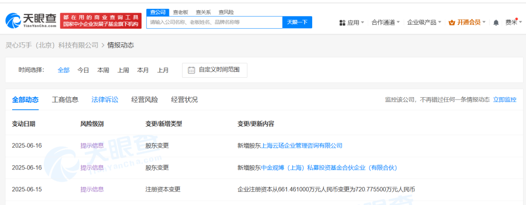 天眼查App显示,近日,灵心巧手(北京)科技有限公司发生工商变更,新增中金观博(上海)私募投资基金合伙企业(有限合伙)、蚂蚁集团全资子公司上海云玚企业管理咨询有限公司为股东,同时注册资本由约661.5万人民币增至约720.8万人民币。