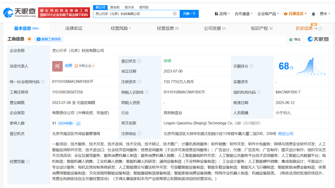 该公司成立于2023年7月,法定代表人为周勇,经营范围包括服务消费机器人制造、服务消费机器人销售、人工智能基础软件开发等,现由中大恒基(北京)数字经济技术发展有限公司、灵动九州(北京)科技中心(有限合伙及上述新增股东等共同持股。