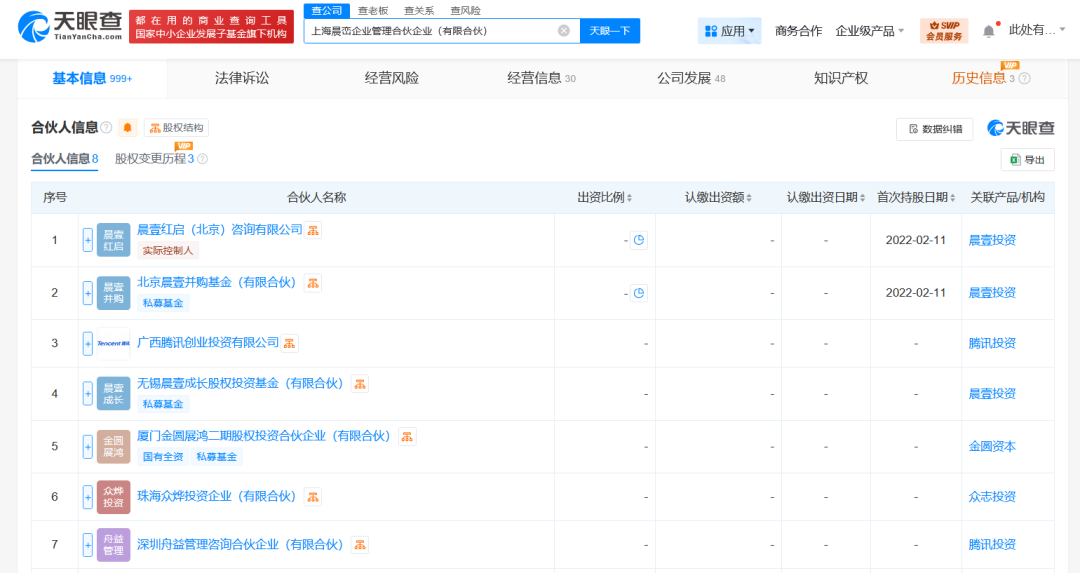天眼查App显示,近日,上海晨峦企业管理合伙企业(有限合伙)发生工商变更,新增广西腾讯创业投资有限公司、无锡晨壹成长股权投资基金(有限合伙)、厦门金圆展鸿二期股权投资合伙企业(有限合伙)、珠海众烨投资企业(有限合伙)等为合伙人。