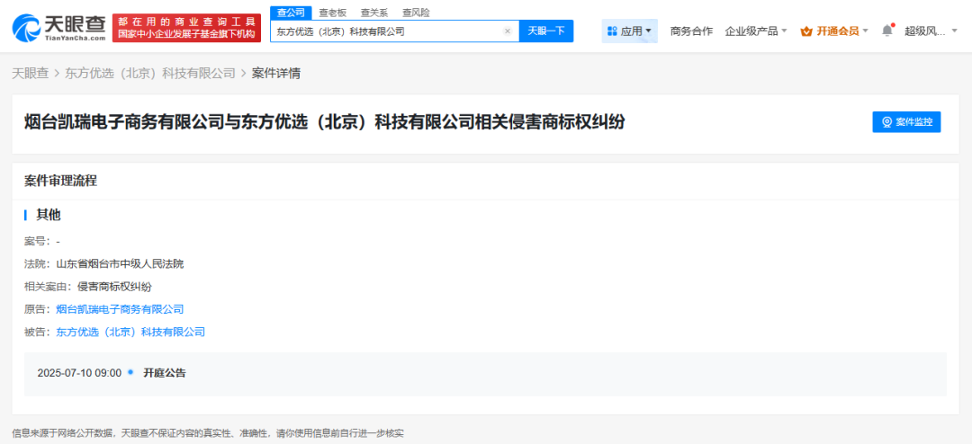 天眼查天眼风险信息显示,近日,东方甄选关联公司东方优选(北京)科技有限公司新增1条开庭公告,原告为烟台凯瑞电子商务有限公司,案由为侵害商标权纠纷,该案将于7月10日在烟台市中级人民法院开庭审理。