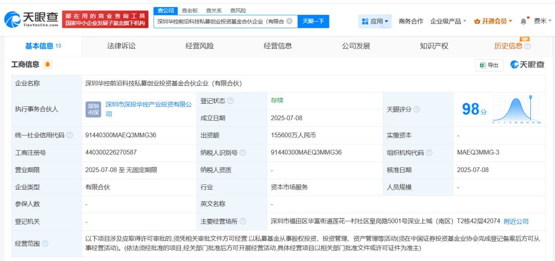 天眼查App显示,近日,深圳华控前沿科技私募创业投资基金合伙企业(有限合伙)成立,执行事务合伙人为深圳市深投华控产业投资有限公司,出资额15.56亿人民币,经营范围为以私募基金从事股权投资、投资管理、资产管理等活动,由京东云计算全资子公司京东科技信息技术有限公司、正大光明企业管理有限公司、上海绩亮创业投资有限公司等共同出资。