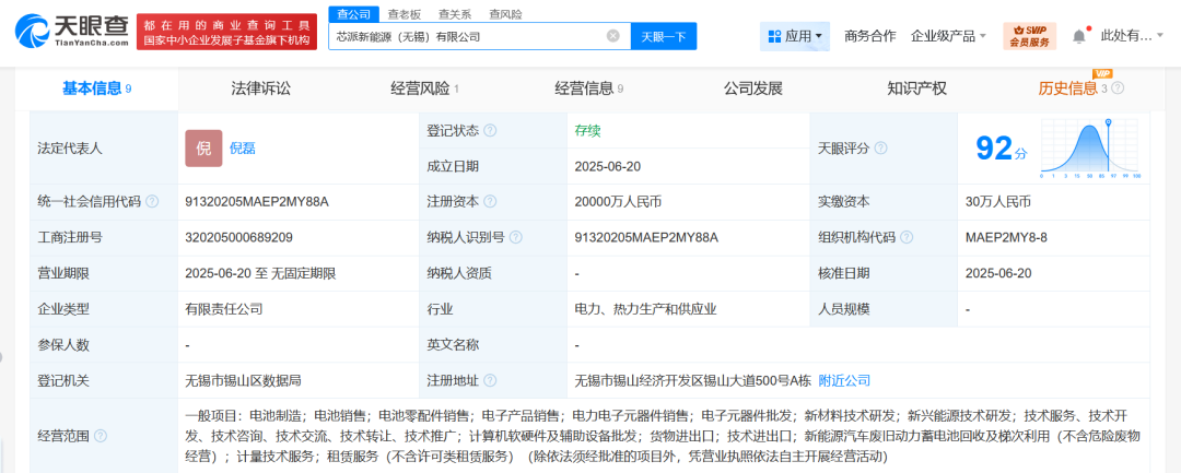 该公司成立于2025年6月20日,法定代表人为倪磊,注册资本2亿人民币,经营范围含电池制造、电池销售、电池零配件销售、电子产品销售、电力电子元器件销售、新材料技术研发、新兴能源技术研发等,由安普瑞斯(无锡)有限公司、华伟、刁媛媛、倪磊共同持股。