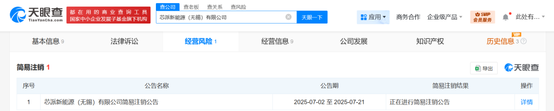 天眼查App显示,近日,芯派新能源(无锡)有限公司新增一则简易注销公告,公告期自7月2日至7月21日。