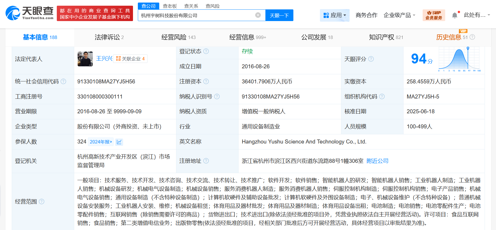 杭州宇树科技股份有限公司成立于2016年8月,法定代表人为王兴兴,注册资本约3.64亿人民币,经营范围含智能机器人的研发、智能机器人销售、工业机器人制造、工业机器人销售、机械设备研发、食品互联网销售、出版物零售等,由王兴兴、汉海信息技术(上海)有限公司、宁波红杉科盛股权投资合伙企业(有限合伙)等共同持股。