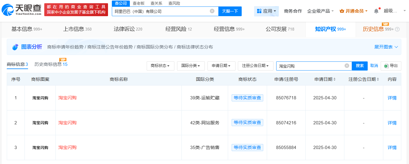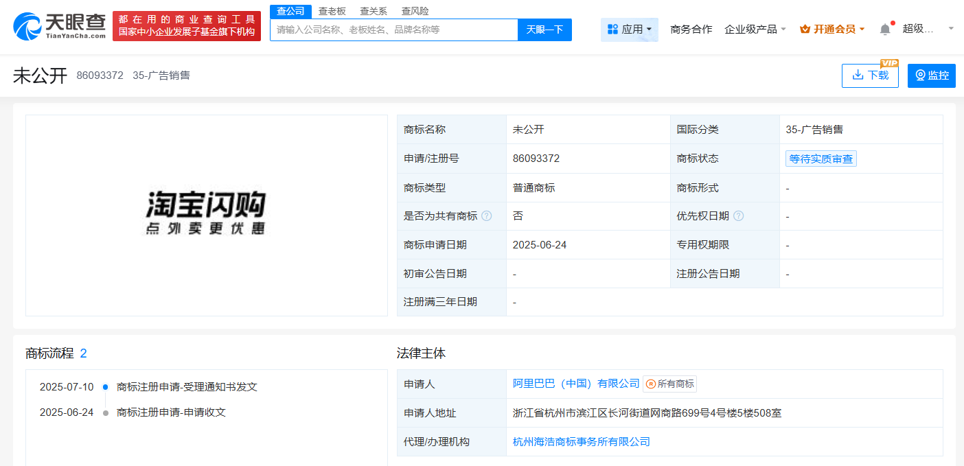 天眼查App显示,近日,阿里巴巴(中国)有限公司申请注册“淘宝闪购 点外卖更优惠”商标,国际分类为广告销售,当前商标状态为等待实质审查。此前,该公司已申请注册3枚“淘宝闪购”商标。