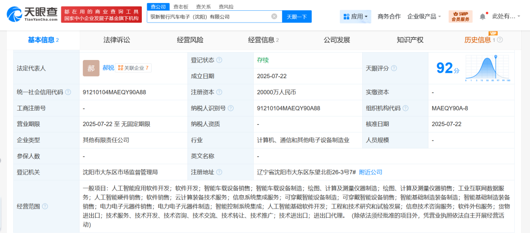 天眼查App显示,近日,驭新智行汽车电子(沈阳)有限公司成立,法定代表人为郝锐,注册资本2亿人民币,经营范围含人工智能应用软件开发、智能车载设备销售、智能车载设备制造、工业互联网数据服务、人工智能硬件销售、软件销售、云计算装备技术服务、信息系统集成服务等。