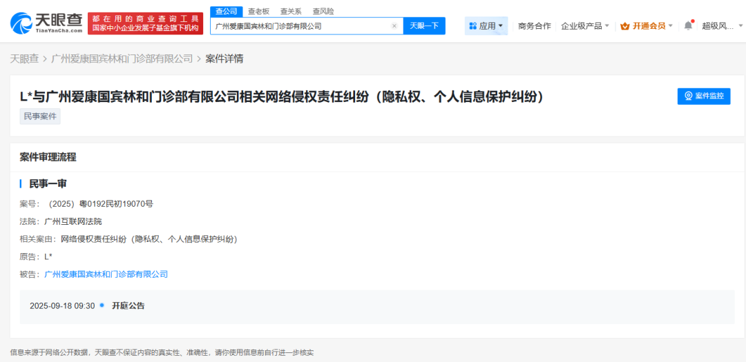 天眼查天眼风险信息显示,近日,广州爱康国宾林和门诊部有限公司新增1条开庭公告,原告为黎某某,案由为网络侵权责任纠纷(隐私权、个人信息保护纠纷),该案将于9月18日在广州互联网法院开庭审理。