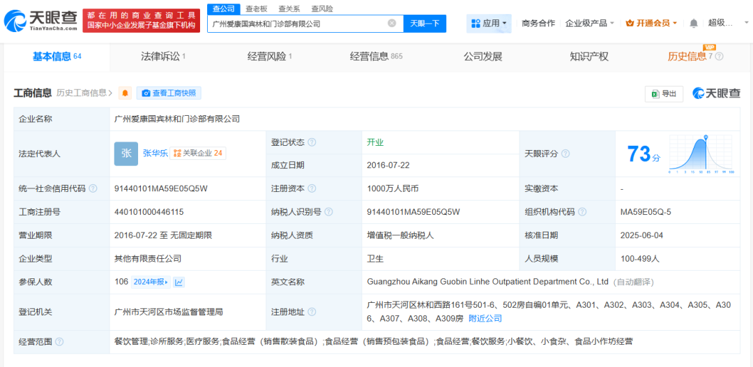 工商信息显示,广州爱康国宾林和门诊部有限公司成立于2016年7月,法定代表人为张华乐,注册资本1000万人民币,经营范围包括餐饮管理、诊所服务等。