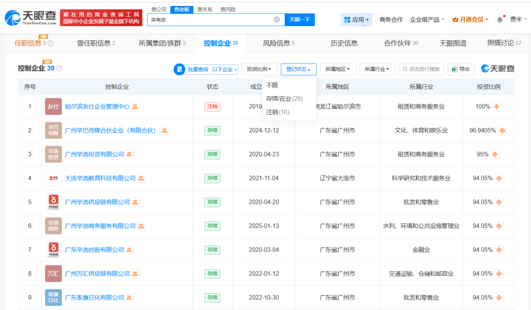 控制企业信息显示,辛巴控制企业39家,其中29家处于存续状态,包括大连辛选教育科技有限公司、广州辛选供应链有限公司、广州辛创商务服务有限公司等,其余10家企业已注销。