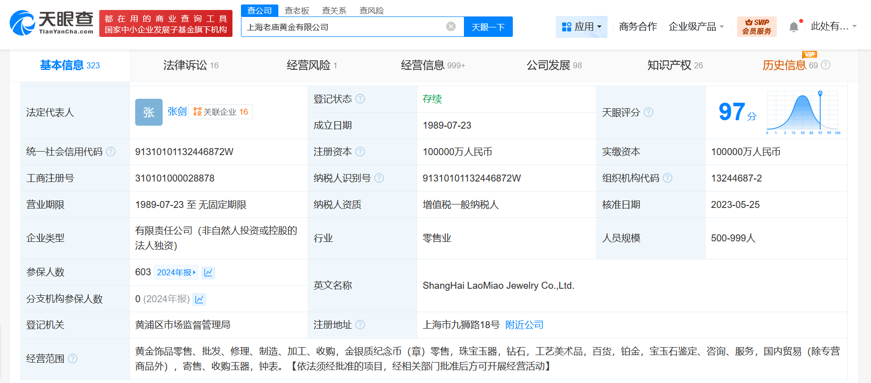 天眼查工商信息显示,老庙黄金关联公司上海老庙黄金有限公司成立于1989年7月,法定代表人为张剑,注册资本10亿人民币,经营范围含黄金饰品零售、批发、修理、制造、加工、收购,金银质纪念币(章)零售,珠宝玉器,钻石,工艺美术品,百货,铂金,宝玉石鉴定、咨询、服务等。