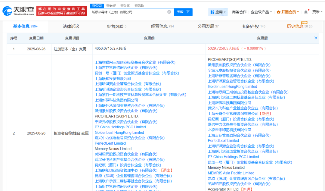 天眼查工商信息显示,近日,昕原半导体(上海)有限公司发生工商变更,原股东上海联知创业投资管理中心(有限合伙)退出,新增蚂蚁集团旗下上海云玡企业管理咨询有限公司、Accelerator XIII Ltd.为股东,注册资本由约4653.7万人民币增至约5029.7万人民币。