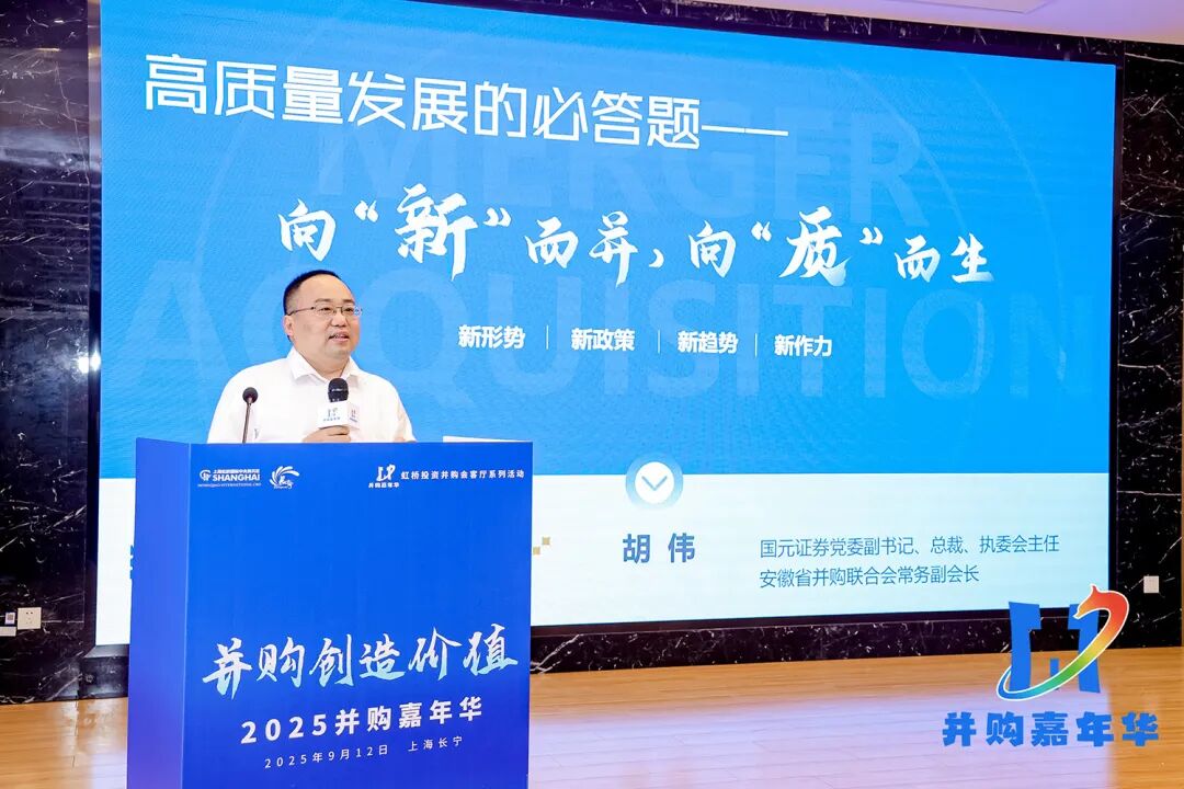 国元证券总裁胡伟演讲主题为“高质量发展的必答题,向’新’而并、向’质’而生”。从四方面展开:新形势下,并购重组从 “选择题” 变为 “必答题”,因中国经济转向高质量发展,上市公司需整合提升,创投退出、居民财富投资等也需并购;新政策上,“并购六条” 等松绑限制,允许跨界并购、亏损科技企业注入等;新趋势是并购量增,以横向产业并购为主,聚焦半导体等领域。他还介绍了安徽省的并购实践,开展培训、意向对接会等,国元证券则聚焦服务实体经济,担当多角色助力并购。