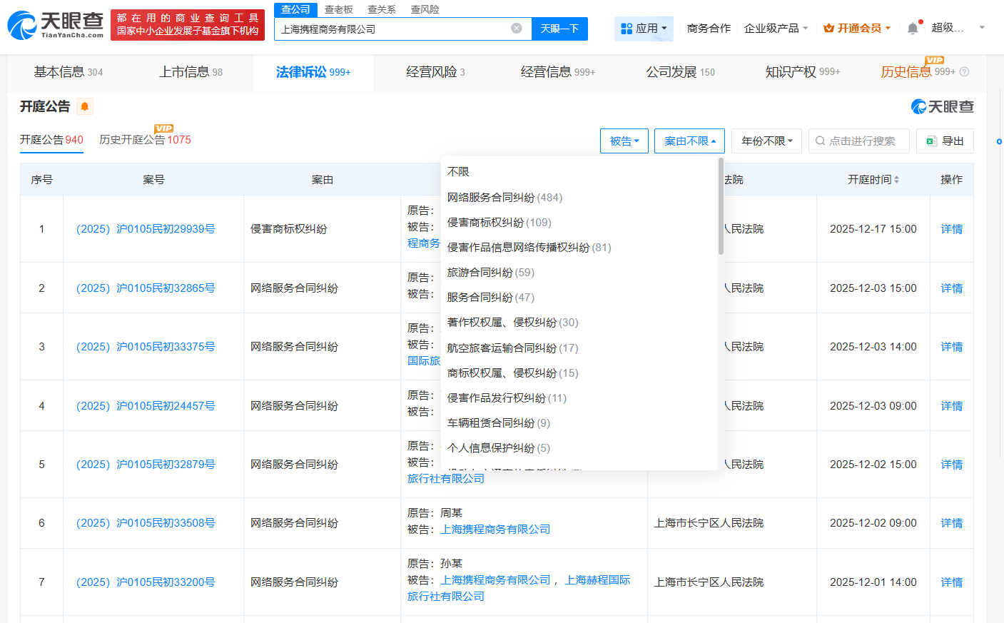 值得注意的是,天眼风险信息显示,携程旗下上海携程商务有限公司涉及多个司法案件,案由多为网络服务合同纠纷。