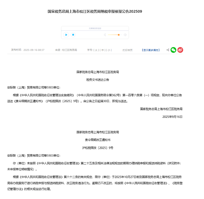 近日,国家税务总局上海市松江区税务局发布“纳税申报催报公告202509”,其中上海嵩隽信息科技有限公司被点名。