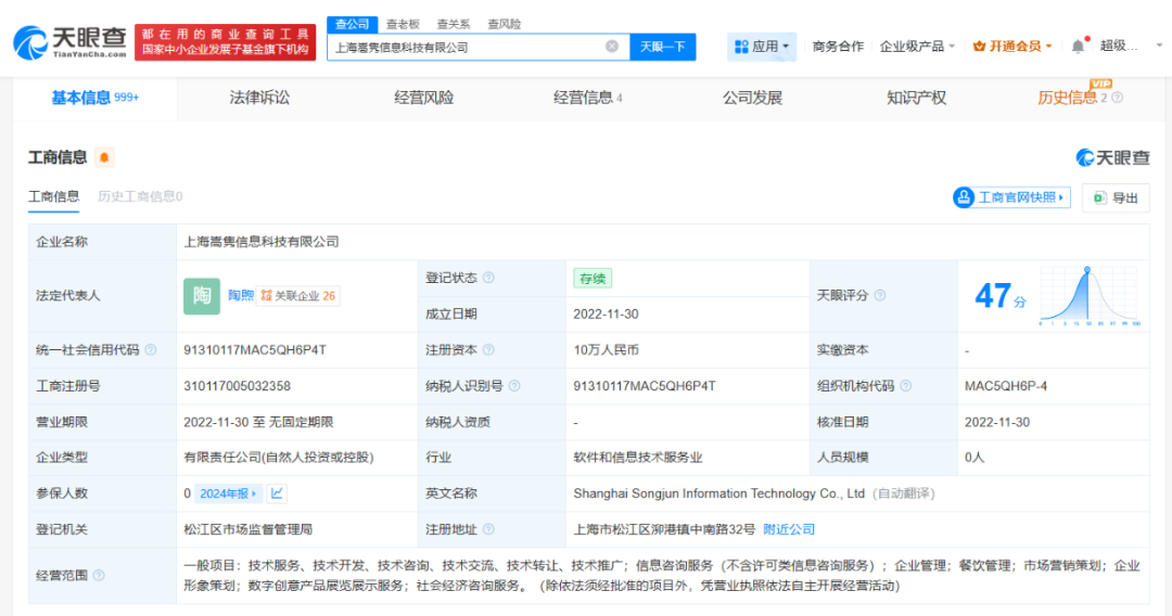 天眼查App显示,上海嵩隽信息科技有限公司成立于2022年11月,法定代表人为陶煦,注册资本10万人民币,经营范围包括企业管理、餐饮管理、市场营销策划等,由陶煦和黄海涛分别持股90%、10%。任职信息显示,陶煦为上海绿捷实业发展有限公司董事长。