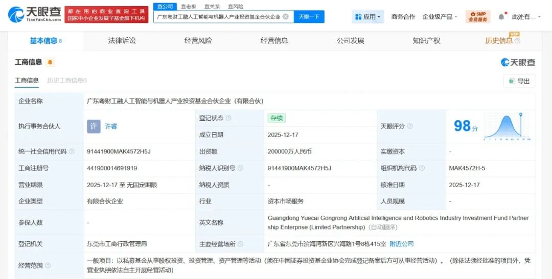 天眼查工商信息显示,近日,广东粤财工融人工智能与机器人产业投资基金合伙企业(有限合伙)成立,执行事务合伙人为许睿,出资额20亿人民币,经营范围含以私募基金从事股权投资、投资管理、资产管理等活动。