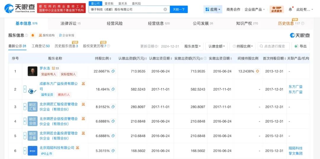 工商信息显示,锤子科技(成都)股份有限公司成立于2012年5月,法定代表人为管志良,注册资本约3149.8万人民币,经营范围含基础软件服务、应用软件服务、组织文化艺术交流活动、维修通讯设备、生产手机等。股东信息显示,该公司由罗永浩、成都东方广益投资有限公司、北京明匠汇智投资管理合伙企业(有限合伙)等共同持股。