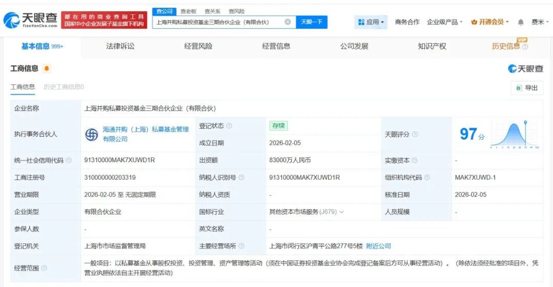 天眼查App显示,2月5日,上海并购私募投资基金三期合伙企业(有限合伙)成立,执行事务合伙人为海通并购(上海)私募基金管理有限公司,出资额8.3亿人民币。