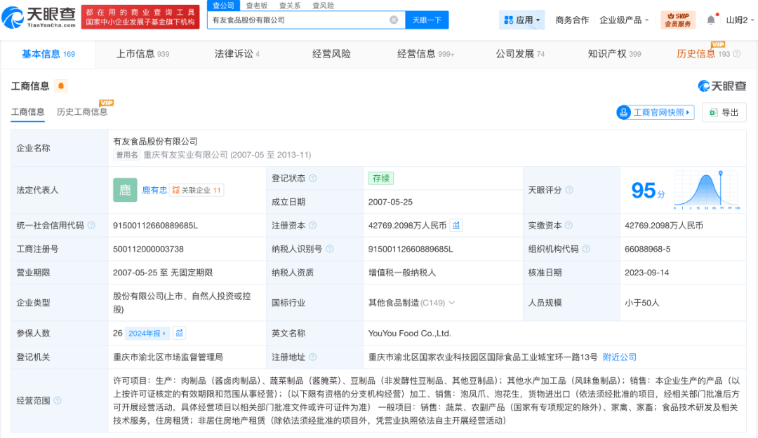 天眼查App显示,有友食品股份有限公司成立于2007年5月,法定代表人为鹿有忠,注册资本约4.3亿人民币,经营范围包括生产肉制品、蔬菜制品、豆制品等,由鹿有忠、赵英、鹿新等共同持股。知识产权信息显示,该公司申请的“包装袋(虎皮凤爪)”“一种鸡爪切制机用鸡爪固定装置”等多项鸡爪专利获授权。
