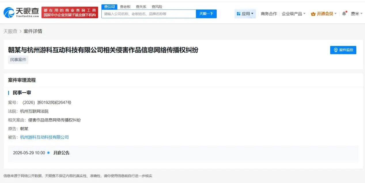 天眼查App显示,近日,黑神话悟空出品方杭州游科互动科技有限公司新增一则开庭公告,案由为侵害作品信息网络传播权纠纷。