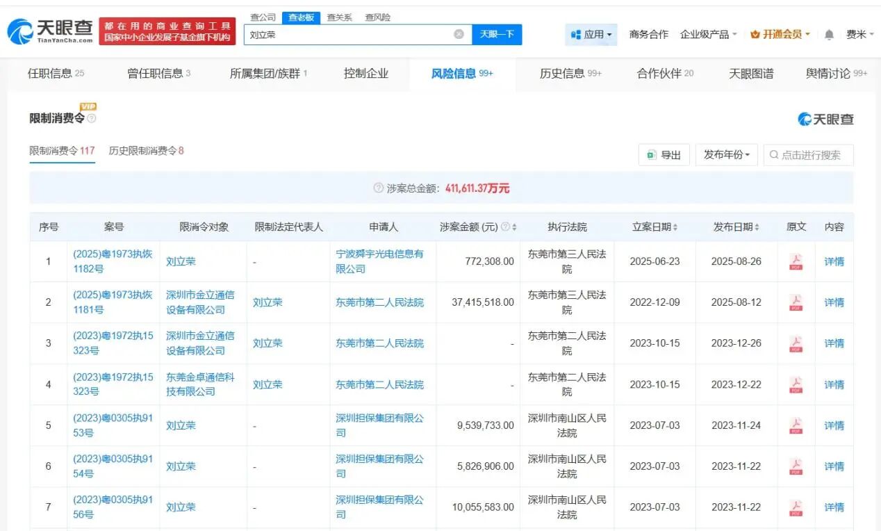 风险信息显示,刘立荣现存多条股权冻结、失信被执行人(老赖)、限制消费令及终本案件信息。
