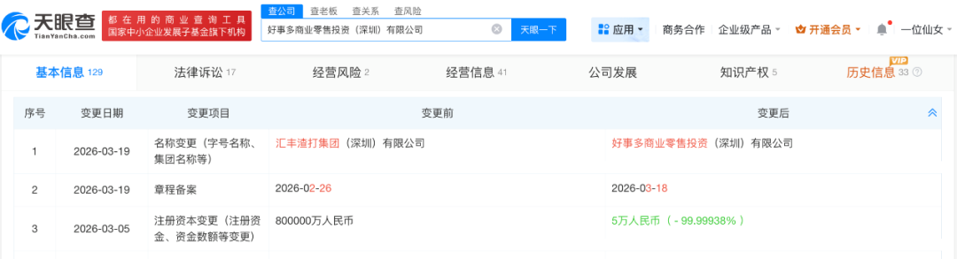 天眼查显示,皮省川曾在好事多商业零售投资(深圳)有限公司(原名为“汇丰渣打集团”)担任总经理、执行董事,后于2024年9月退出。就在其退出后的次月,渣打银行(中国)有限公司公开发布澄清公告,确认英国渣打银行及渣打集团与该公司及其股东无任何关联,相关宣传均为不实信息。变更记录显示,2026年3月,该公司注册资本从80亿元骤减至5万元,并更名为“好事多商业零售投资(深圳)有限公司”。
