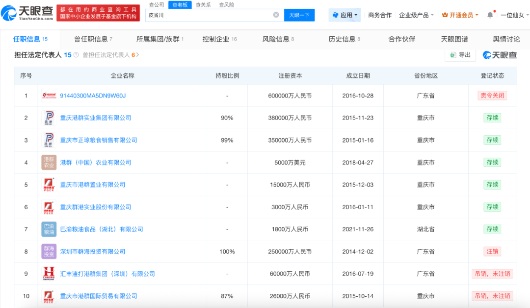 皮省川目前担任法定代表人的企业达15家,曾担任法定代表人的企业共6家,注册资本从2万元到38亿元不等