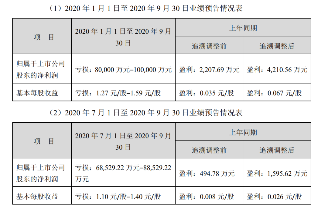 10月14日,广州浪奇发布了2020年前三季度业绩预告,预计报告期内该公司或亏损8亿元—10亿元,而上年同期为盈利2207.69万元,其中仅第三季度就亏损6.85亿元—8.85亿元,上年同期为盈利494.78万元。