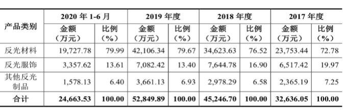 报告期内,该公司主营业务收入分别为3.26亿元、4.52亿元、5.28亿元和2.47亿元。其中,反光材料为最大的收入来源,占主营收入的比例分别为72.78%、76.52%、79.67%和79.99%,比重较大且逐年上升。