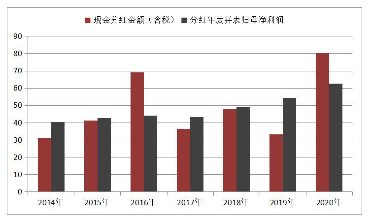 2020年,公司现金分红金额高达80.38亿元(含税),而该年归母净利润62.56亿元,现金分红占到了归母净利润的128.49%。即便梳理过往数据,也不难发现,此次分红可谓“大手笔”。