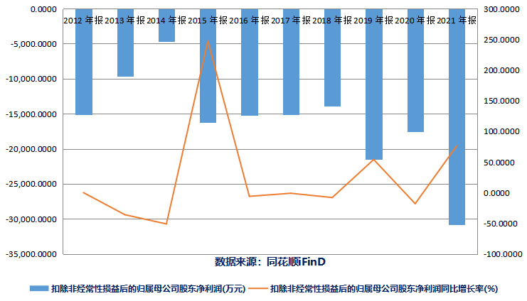 2021年,公司营业收入同比下滑46.67%。而从2012年起,该公司扣非净利润都是亏损状态,其中2021年的扣非净利润为-3.09亿元,创下公司上市后扣非净利润亏损规模之最。