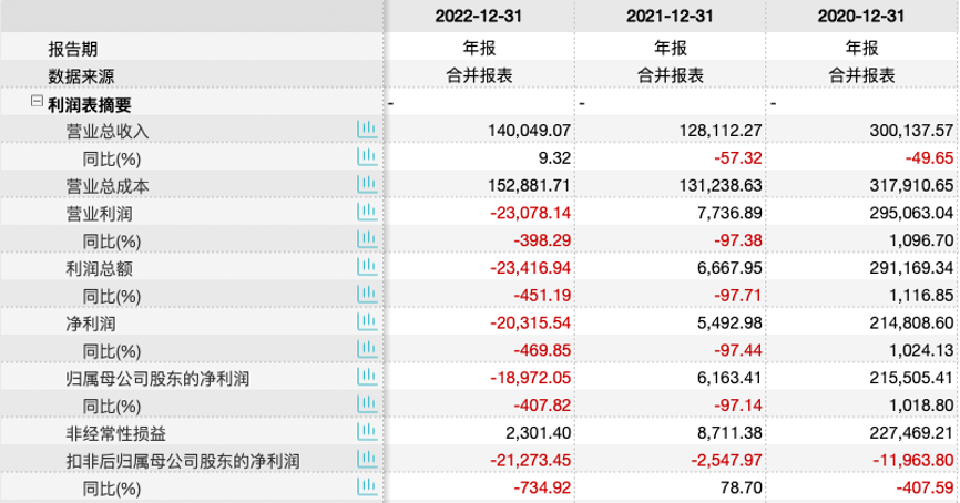 据年报显示,2020年至2022年三年间,该公司营业收入分别是30.01亿元、12.81亿元和14.00亿元,归母净利润分别为21.55亿元、0.62亿元和-1.90亿元。