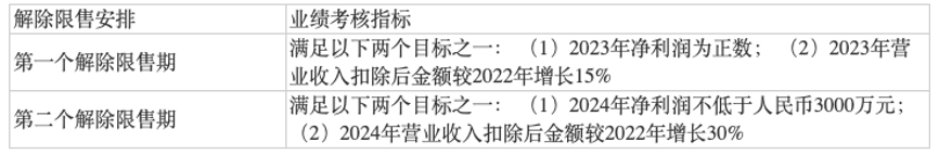 而根据该公司此前发布的股权激励计划(草案),考核年度为2023年和2024年两个会计年度,其中,公司层面的业绩考核指标为2023年净利润为正数,或者2023年营业收入扣除后金额较2022年增长15%;第二个指标为2024年净利润不低于人民币3000万元,或者2024年营业收入扣除后金额较2022年增长30%。在完成相应的指标后,个人获得的股票将解除限售期。