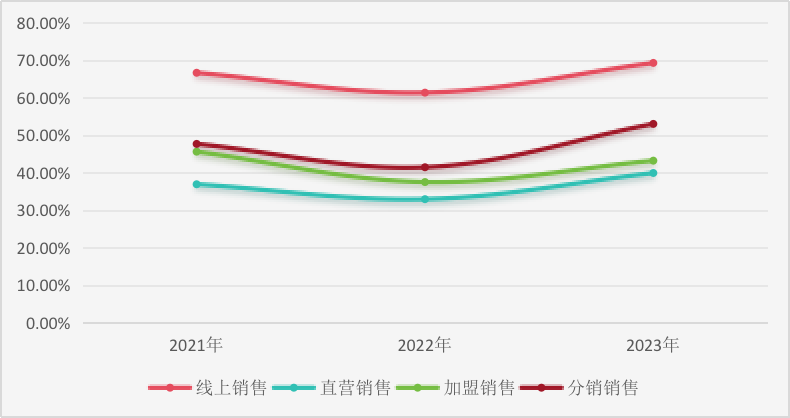 年报显示,2023年,万事利的线上销售、直营销售(包括销售团队和直营门店及展示营销中心渠道)、加盟销售、分销销售(包括经销商、代销商渠道)的毛利率依次为69.35%、39.97%、43.26%、53.07%,均较上年有所提升;且各渠道毛利率存在较大差异,仅线上与直营的差异就逾29个百分点。