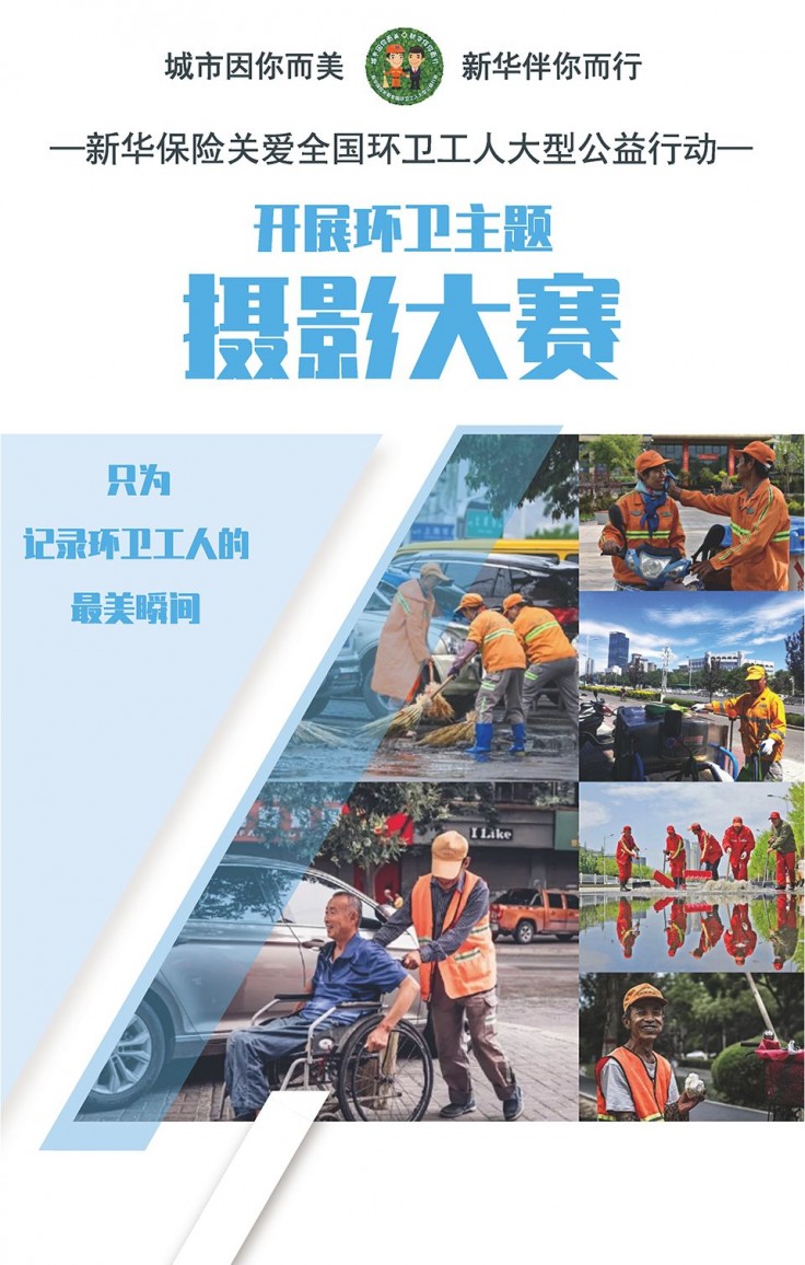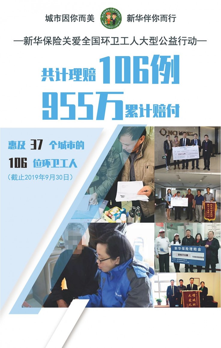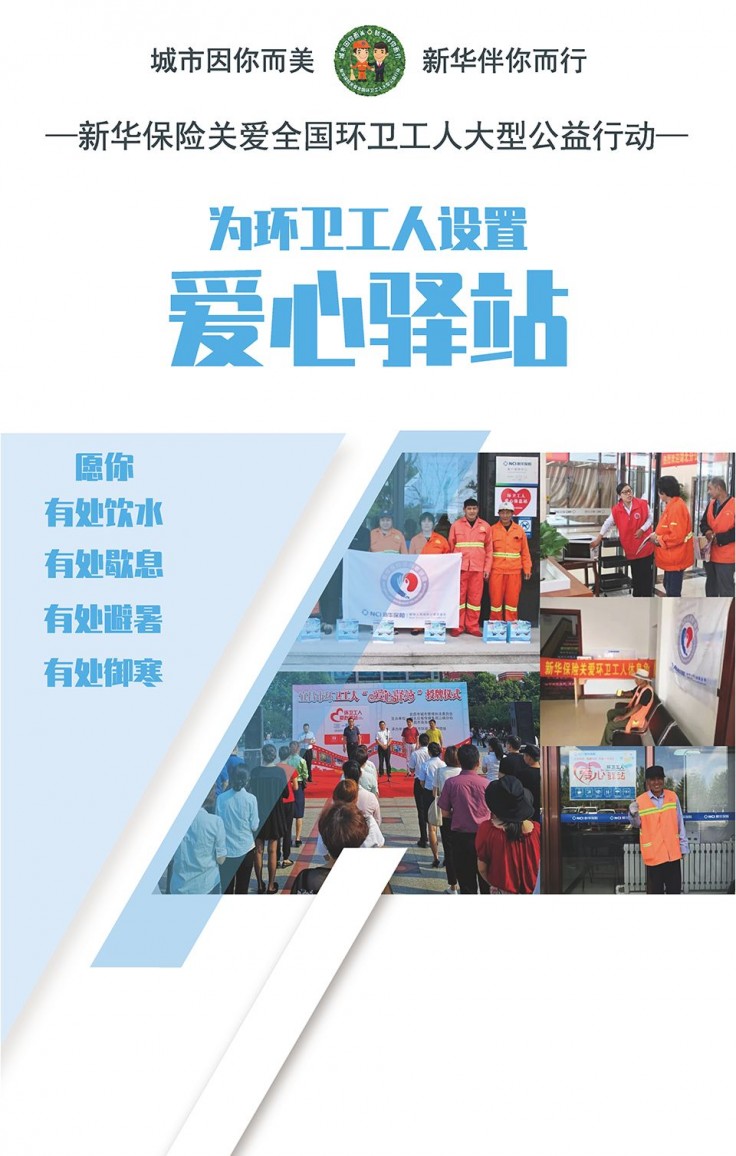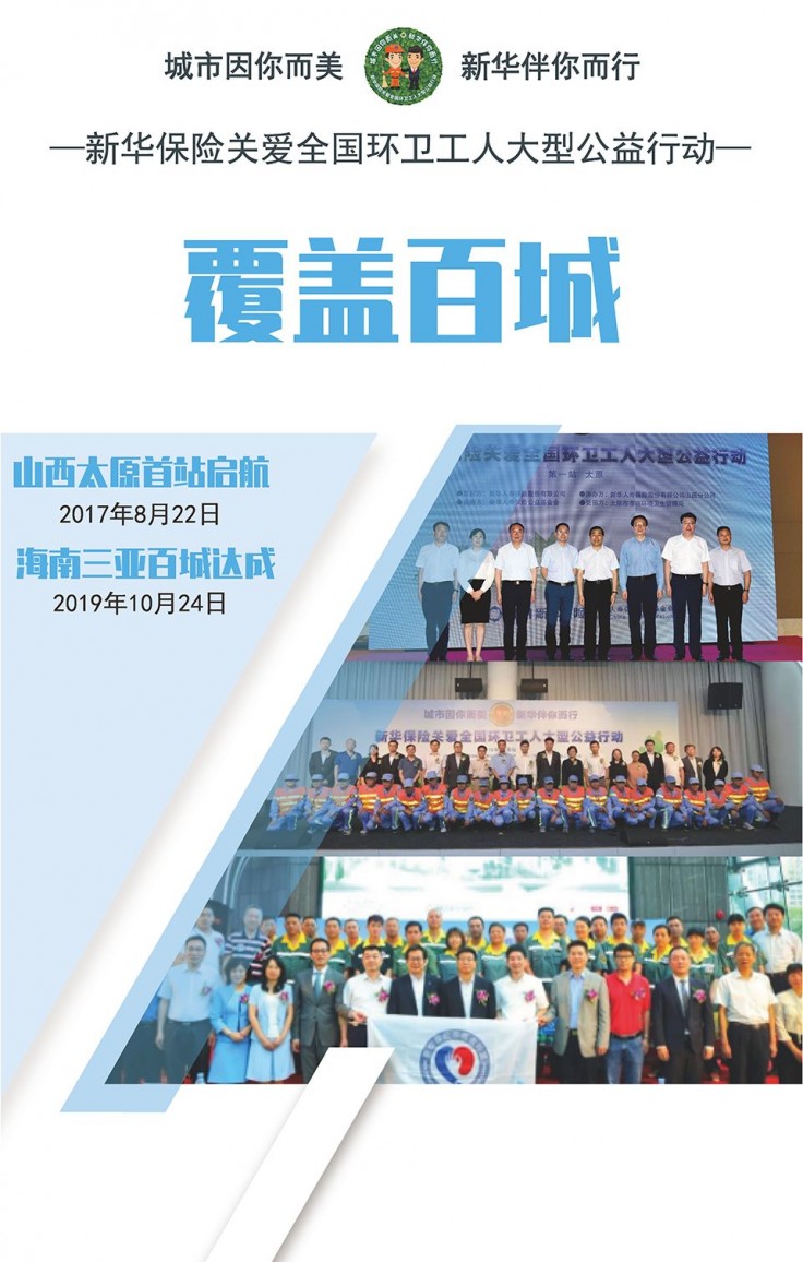 新华保险关爱全国环卫工人大型公益行动的主题是“城市因你而美·新华伴你而行”,旨在为高强度劳动、高风险频发的环卫工人提供量身定做的人身意外保险,也是新华人寿保险公益基金会实施的首个项目、主打项目、特色项目,将保险产品和公益事业结合在一起,针对环卫工人群体开发专属保险计划。项目自2017年8月22日在山西太原启动,南至海南三亚,北至黑龙江七台河,东至山东威海,西至新疆阿克苏,至今已覆盖100个城市,包括4个直辖市、26个省会城市、5个计划单列市和65个地级城市。其中,上海、广州两市均超过了5万人。