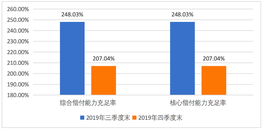 2019年第四季度偿付能力报告显示,当季末,该公司综合偿付能力充足率和核心偿付能力充足率均为207.04%,较上季度末下降40.99个百分点,较2018年末大幅下降194.16个百分点。