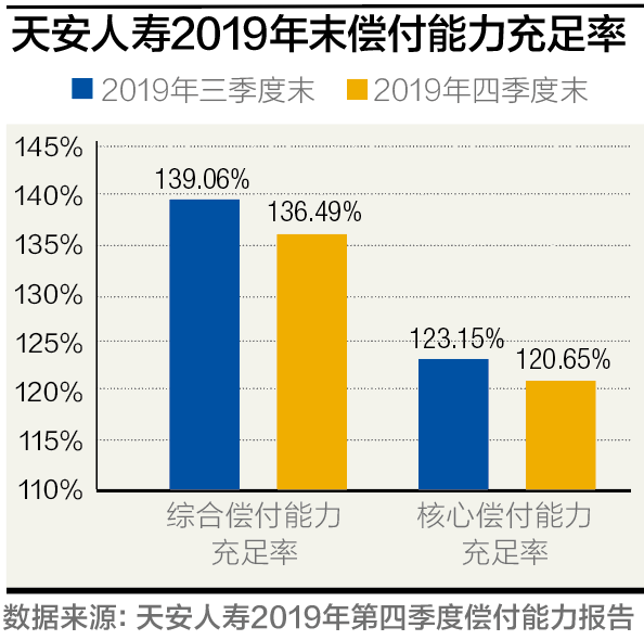 纳入统计的人身险公司共有73家。其中,天安人寿2019年末综合偿付能力充足率为136.49%,核心偿付能力充足率为120.65%,在73家公司中分别排在第64位和第66位。