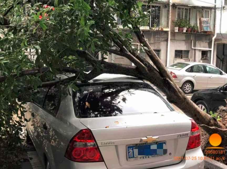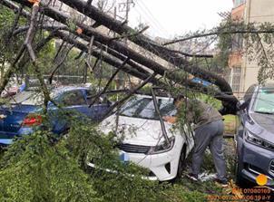 阳光财险上海分公司接到客户报案,客户车辆被倾倒的树木砸损,理赔人员接报案后,立即冒雨赴现场查勘。