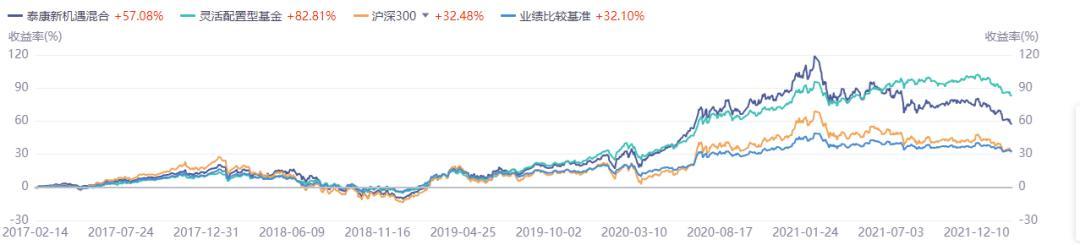 此外,桂跃强还颇为敢于重仓单只个股,在他管理的灵活配置型基金泰康新机遇中,2021年四季度第一重仓股美的集团持仓市值占基金净值比例高达10.39%。而同类产品中这一占比大多低于10%,超半数在8%以下。
