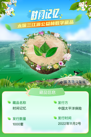 以太保三江源公益林的树木年轮、树叶、花果为原型,太保设计了“时间记忆”数字藏品,铭记让荒地变绿洲的时光。让更多的人关注三江源、参与生态保护,与中国太保一起,共同守护中华水搭。