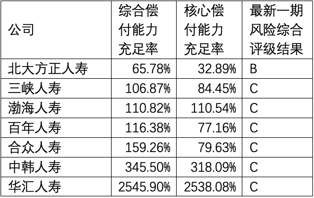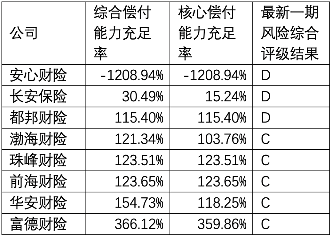 可见,上述统计中,风险综合评级未符合监管要求的公司共有14家。其中,富德财险、珠峰财险、华安财险、渤海财险、前海财险5家财险公司以及中韩人寿、三峡人寿、百年人寿、华汇人寿、渤海人寿、合众人寿6家寿险公司最新一期风险综合评级为C类,安心财险、都邦财险、长安保险3家财险公司为D类。