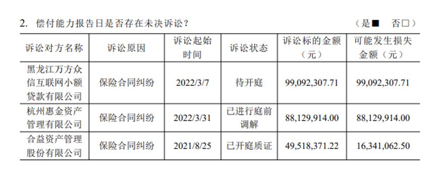 值得注意的是,截止2022年四季度末,安心财险还背负着多笔未决重大诉讼,可能发生损失金额合计超过2亿元。