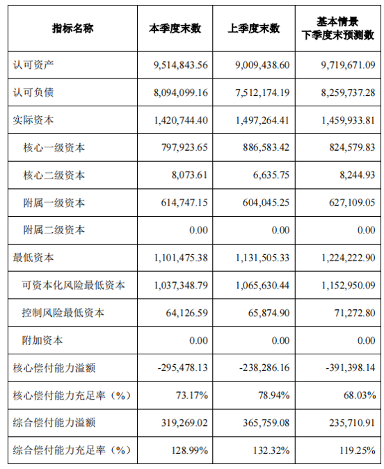据2023年第二季度偿付能力报告显示,截至今年二季度末,幸福人寿的综合偿付能力充足率为128.99%,较上季度末降低3.33个百分点;核心偿付能力充足率为73.17%,较上季度末降低5.77个百分点。