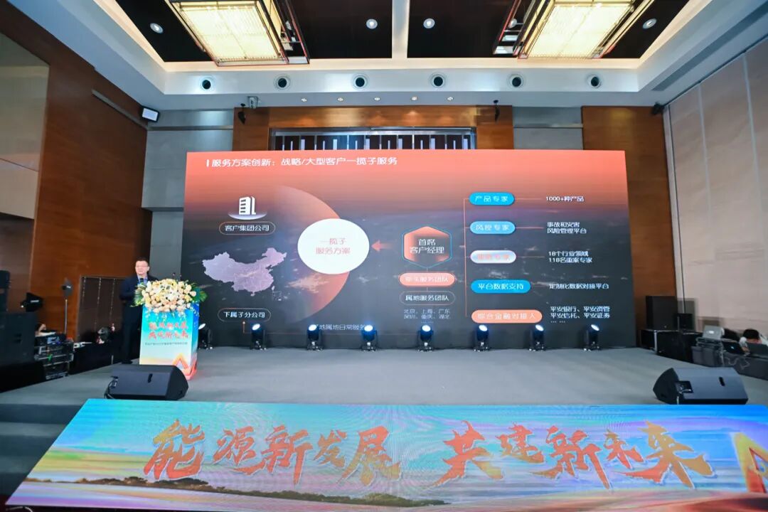 平安产险团体事业群保翰璋作《服务国家战略,平安使命担当》主题报告,平安产险始终坚持稳健的经营,以“共生、共好”为理念,为客户提供一揽子服务方案、提升客户服务水平和质量,为电力基础设施领域、新能源领域和石油石化领域的多个国家战略项目保驾护航,助力能源领域企业推动产业升级,加快绿色低碳转型。