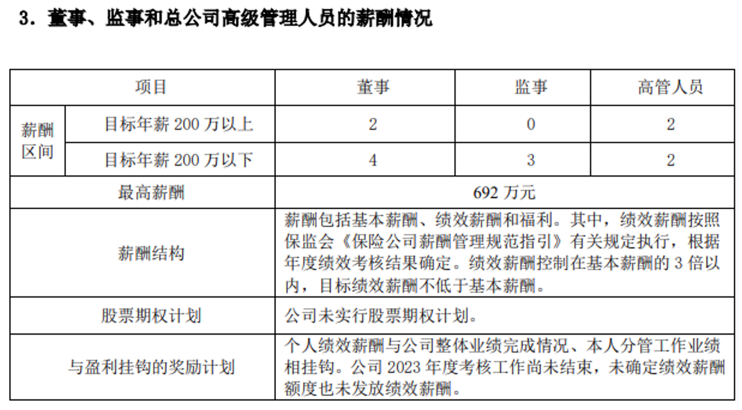 和泰人寿2023年第四季度偿付能力报告显示,董监高中目标年薪在200万元以上的有四人,在200万元以下的有九人,最高薪酬为692万元。