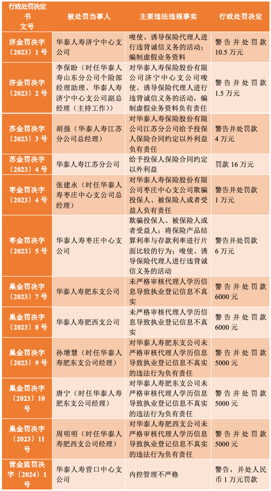据标点财经、投资时间网研究员统计,去年以来,华泰人寿多家分支机构及相关责任人共收到国家金融监督管理总局各派出机构开出的罚单十余份。具体来看,涉及的违法违规事实主要包括:唆使、诱导保险代理人进行违背诚信义务的活动;编制虚假业务资料;给予投保人保险合同约定以外利益;欺骗投保人、被保险人或者受益人;将保险产品结算利率与存款利率进行片面比较;未严格审核代理人学历信息导致执业登记信息不真实;内控管理不严格。
