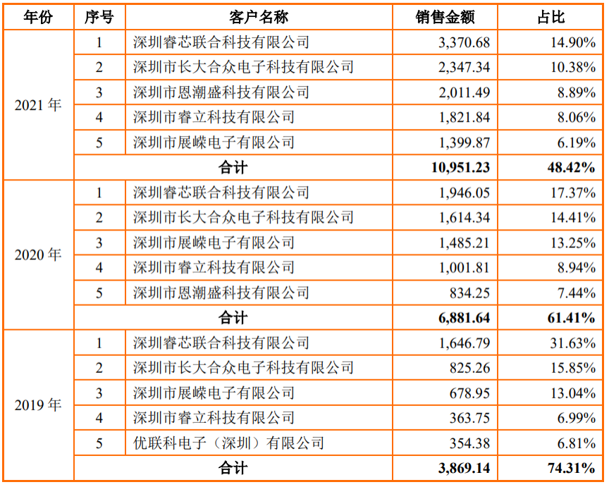 在产品的销路上,珠海智融根据行业惯例选取了经销模式。报告期内珠海智融前五大客户均为经销商,且均为深圳的企业,前五大客户销售收入合计占营业收入的比例分别为74.31%、61.41%和48.42%,集中度相对较高,其中,有两家公司2017年才成立,成立不久便跻身珠海智融大客户。