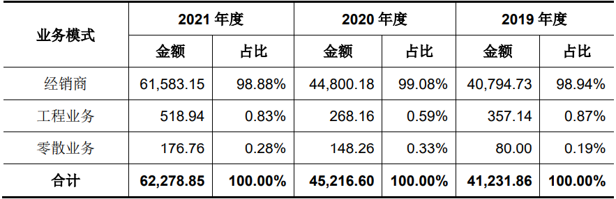 相应地,科凡家居的主营业务收入也严重依赖经销模式。数据显示,该公司各期经销模式收入分别为4.08亿元、4.48亿元、6.16亿元,占主营业务收入的比例分别为98.94%、99.08%和98.88%,占比均在98%以上。